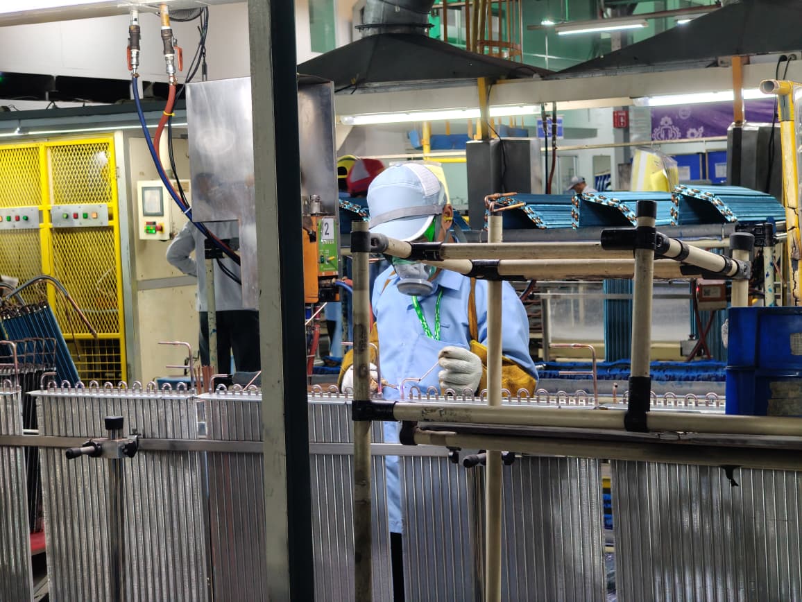 Perjalanan dimulai dari press shop tempat bodi outdoor unit dibentuk. Enam mesin press bekerja menghasilkan panel yang tahan karat. Proses berlanjut ke area pengerjaan evaporator dan kondensor di mana pipa tembaga dipotong dan dibentuk sesuai kebutuhan komponen pendingin.