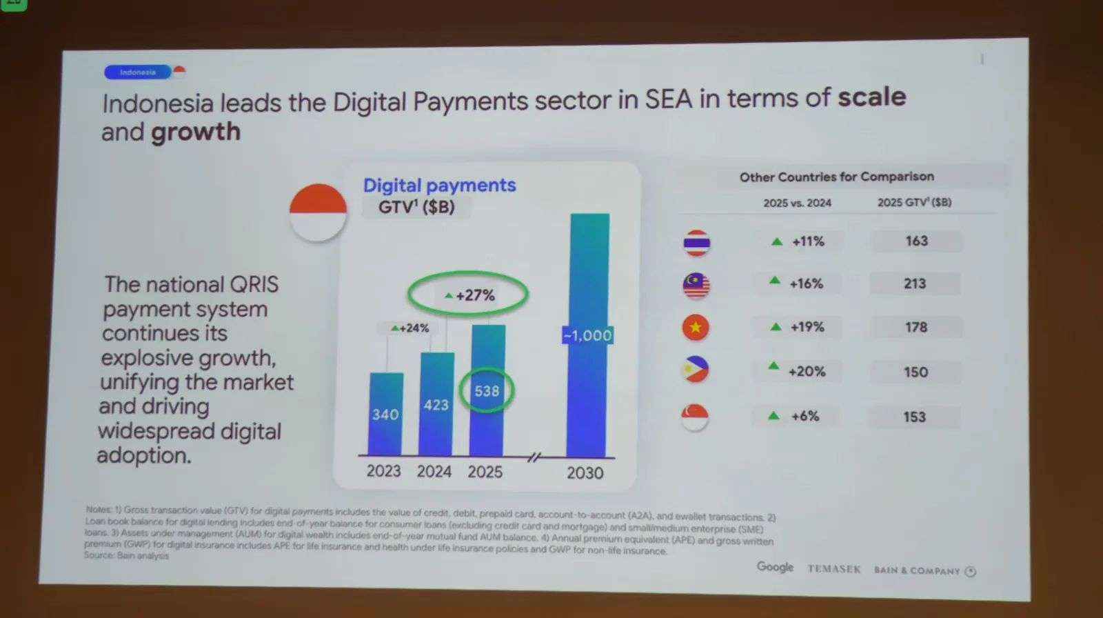 Dalam laporan e-Conomy SEA 2025 yang dirilis oleh Google, Tamasek, dan Bain & Company, mengungkapkan bahwa pembayaran digital mengalami pertumbuhan yang sangat pesat bahkan tercepat di Asia Tenggara. Nilainya diproyeksikan mencapai USD 538 miliar dalam Gross Transaction Value (GTV) pada 2025, gabungan antara kartu kredit, debut, prabayar, antar-rekening dan e-wallet.