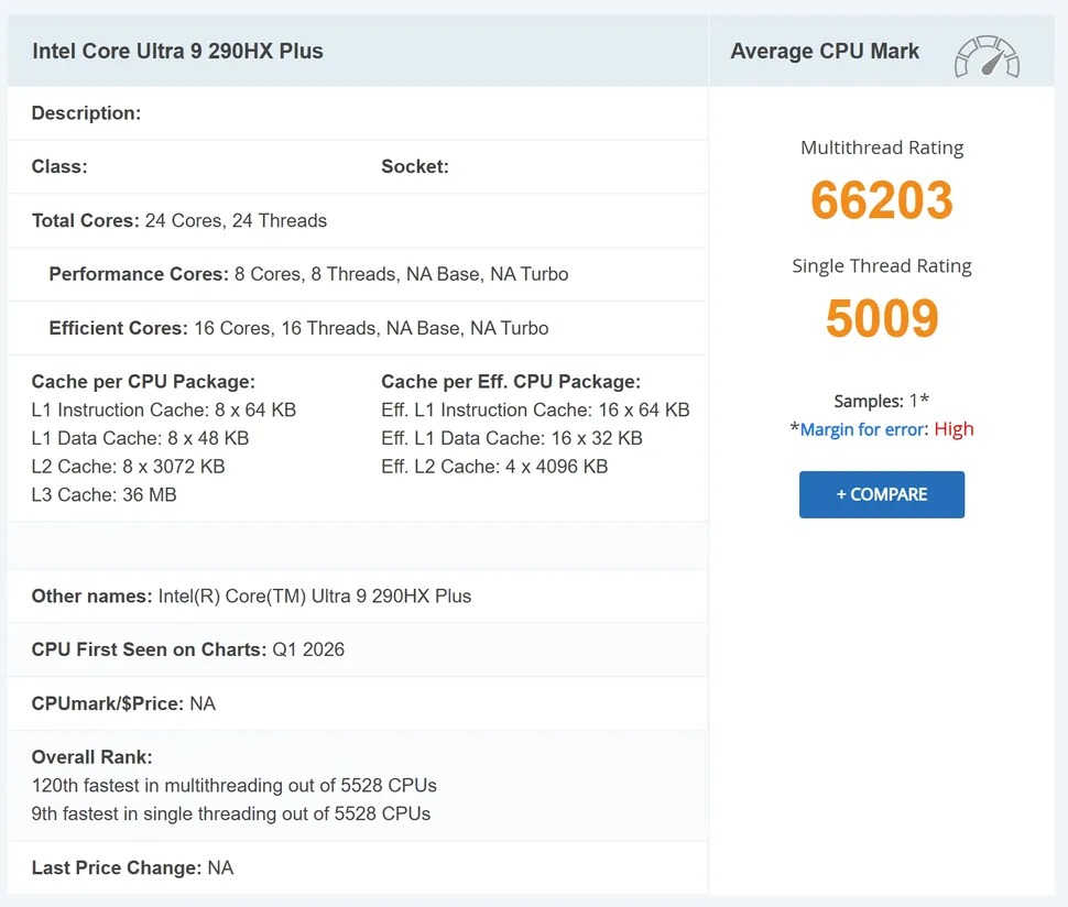 Meski begitu, hasil ini belum bisa dianggap sebagai patokan mutlak. Data PassMark tersebut berasal dari satu kali pengujian. Dalam daftar yang sama, Core Ultra 9 290HX Plus terlihat mampu boost hingga 5,45 GHz. Ada pula dugaan bahwa laptop pengujinya memakai memori DDR5-5600 SO-DIMM dari Samsung.
