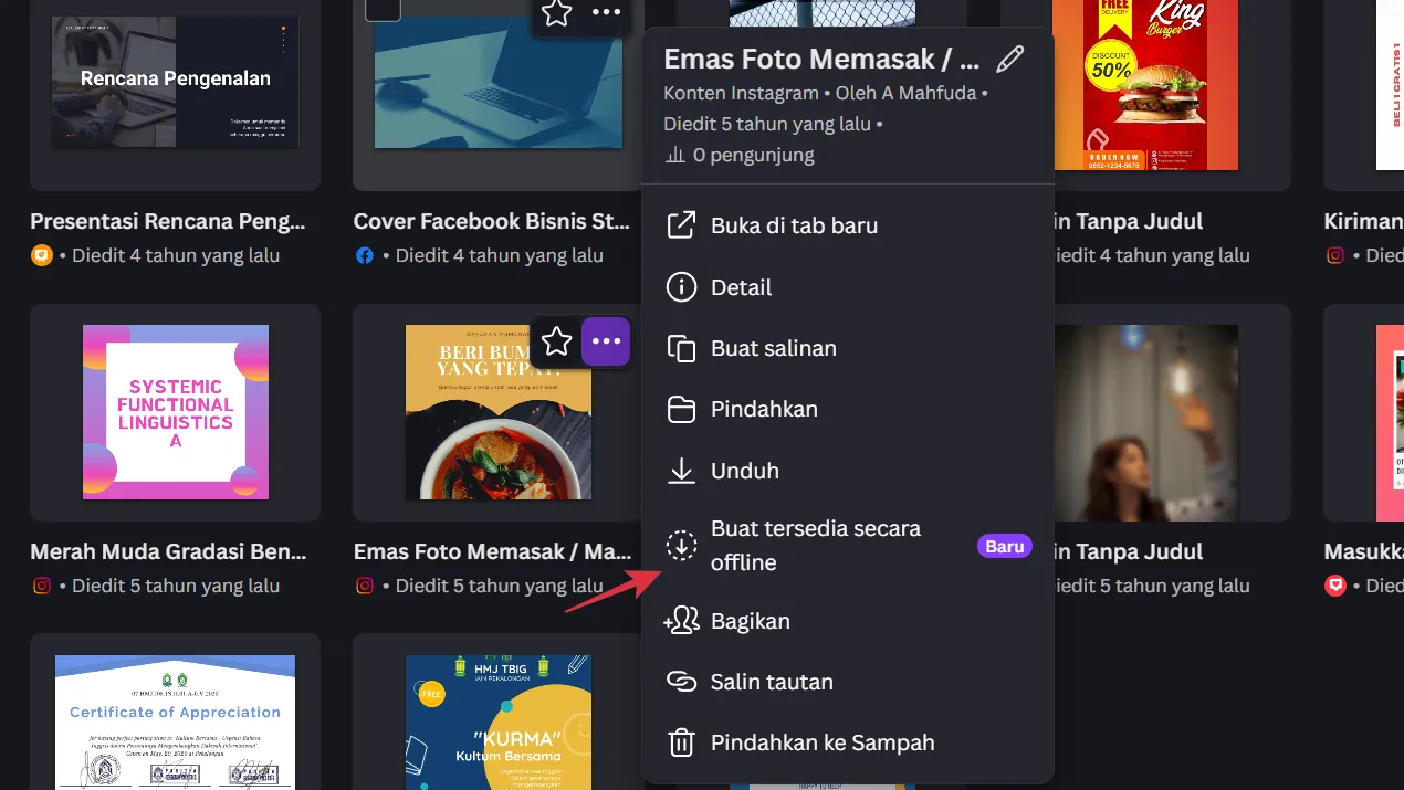 Sebelum bisa menggunakan Canva secara offline, langkah pertama yang harus kita lakukan adalah membuatnya tersedia secara lokal. Pilih salah satu desain lalu klik menu titik tiga dan pilih opsi baru “Make available offline” atau dalam Bahasa Indonesia “Buat tersedia secara offline”.